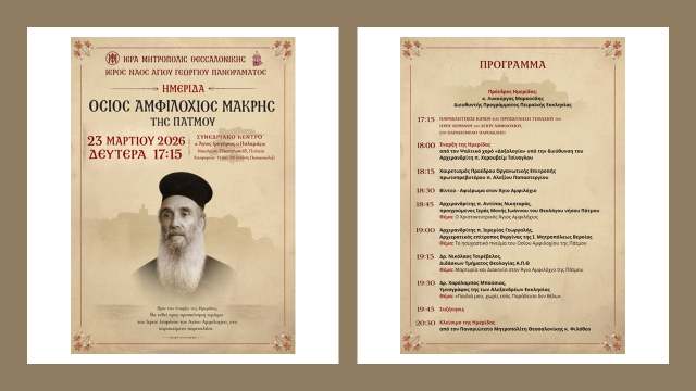 Η αγιολογική ημερίδα με θέμα: «Όσιος Αμφιλόχιος (Μακρής) της Πάτμου» θα πραγματοποιηθεί υπό την ευλογία του Μητροπολίτη Θεσσαλονίκης, κ.κ. Φιλόθεου στις 5.15 το απόγευμα της Δευτέρας 23 Μαρτίου 2026 με διοργανωτή τον ενοριακό Ιερό Ναό του Αγίου Γεωργίου Πανοράματος στο αμφιθέατρο του Εκπαιδευτικού και Πολιτιστικού Ιδρύματος της Ιεράς Μητροπόλεως Θεσσαλονίκης «Άγιος Γρηγόριος ο Παλαμάς» (Νικολάου Πλαστήρα 65 – περιοχή Χαριλάου)