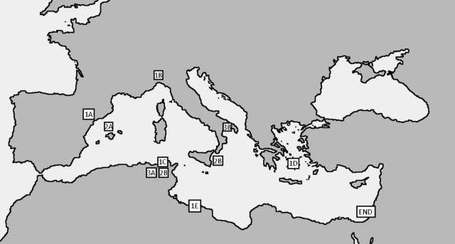 Χάρτης του ταξιδιού και στάσεις των διαφόρων νηοπομπών. Α: Ισπανική νηοπομπή. Β: Ιταλικές νηοπομπές. Γ: Τυνησιακή νηοπομπή· Δ: Ελληνική νηοπομπή· Ε: Λιβυκή νηοπομπή. ΤΕΛΟΣ: προορισμός, Λωρίδα της Γάζας. Φωτογραφία: By VitoxxMass – Own work, CC0, https://commons.wikimedia.org/w/index.php?curid=174428306