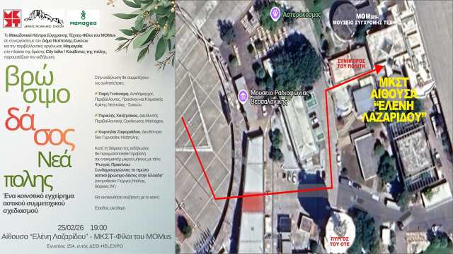 Εκδήλωση παρουσίασης του πρώτου Βρώσιμου Δάσους Νεάπολης στη Θεσσαλονίκη θα πραγματοποιήσει το Μακεδονικό Κέντρο Σύγχρονης Τέχνης – Φίλοι του ΜΟΜus σε συνεργασία με το δήμο Νεάπολης – Συκεών και την περιβαλλοντική οργάνωση «Μαμαγαία» (Mamagea) στις 7 το απόγευμα της Τετάρτης 25 Φεβρουαρίου 2026 στην αίθουσα «Ελένη Λαζαρίδου», (εντός της ΔΕΘ).