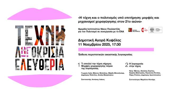 «Η τέχνη και ο πολιτισμός υπό επιτήρηση: μορφές και μηχανισμοί χειραγώγησης στον 21o αιώνα», είναι το θέμα της ημερίδας που θα πραγματοποιήσει το Ινστιτούτο Νίκος Πουλαντζάς σε συνεργασία με το Ινστιτούτο Εναλλακτικών Πολιτικών ΕΝΑ, στις 5.30 το απόγευμα της Τρίτης 11 Νοεμβρίου 2025 στη Δημοτική Αγορά Κυψέλης, στην Αττική.
