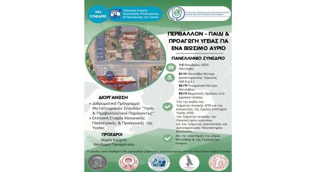 «Περιβάλλον και Παιδί – Προαγωγή Υγείας για ένα Βιώσιμο Αύριο», είναι το θέμα του πανελλήνιου συνεδρίου, που θα πραγματοποιήσει το διϊδρυματικό πρόγραμμα μεταπτυχιακών σπουδών (ΔΠΜΣ) «Υγεία και Περιβαλλοντικοί Παράγοντες» από το Σάββατο 1 Νοεμβρίου έως και τη Δευτέρα 3 Νοεμβρίου 2025, στο Μέτσοβο