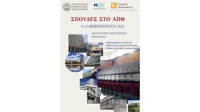 Τη διαδικτυακή ενημερωτική εκδήλωση επαγγελματικού Προσανατολισμού για μαθήτριες και μαθητές της Β’ και της Γ΄ Λυκείου, με θέμα: «Σπουδές στο Αριστοτέλειο Πανεπιστήμιο Θεσσαλονίκης» θα πραγματοποιήσουν το Γραφείο Διασύνδεσης Σπουδών και Σταδιοδρομίας του Αριστοτελείου Πανεπιστημίου Θεσσαλονίκης (ΑΠΘ) και η Περιφερειακή Διεύθυνση Πρωτοβάθμιας και Δευτεροβάθμιας Εκπαίδευσης (ΠΔΕ) Κεντρικής Μακεδονίας στις 9 το πρωί- 2.30 το μεσημέρι , από τη Δευτέρα 9 έως και την Παρασκευή 13 Φεβρουαρίου του 2026.