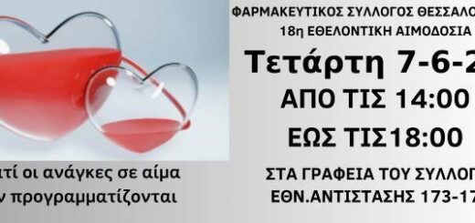 Σε συνεργασία με την υπηρεσία Αιμοδοσίας του νοσοκομείου «Άγιος Παύλος» Την 18η εθελοντική αιμοδοσία διοργανώνει ο Φαρμακευτικός Σύλλογος Θεσσαλονίκης (ΦΣΘ) από τις 2 το μεσημέρι έως και τις 6 το απόγευμα της Τετάρτης 7...